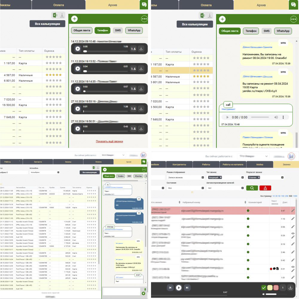 При звонке от клиента, в углу появляется небольшое окно с информацией о звонящем: ФИО, записан ли он уже куда-то на ремонт, в каком статусе находится корзина и другое. Так же прямо из программы Вы можете прослушивать архив звонков. В разделе Общение клиентам можно отправлять смс или напрямую общаться через группу в WhatsApp или ВК. При получении сообщения в углу так же отображается небольшое окно с информацией и самим сообщением.