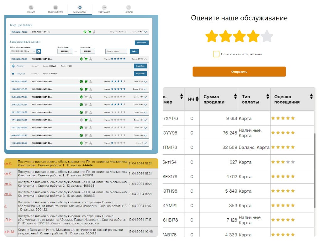Ваши клиенты могут оценить качество работы перейдя по ссылке в смс или в Личном кабинете и всё это будет отображаться в программе. При низкой оценке автоматически будет создаваться тикет и оповещать Вас.
