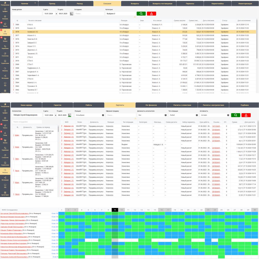 Весь необходимый функционал для комфортной работы в программе, который в данный момент доступен. Это включает управление клиентской базой, учет работ, складской учет, финансовый учет и так далее.