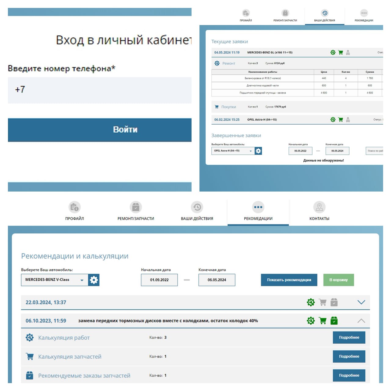 Личный кабинет - это отдельная программа для Ваших клиентов, где они самостоятельно могут выбрать нужные им работы, заказать запчасти, записаться на ремонт. Так же просмотреть всю свою историю ремонта, включая текущие заявки. Увидеть оставленные Вами рекомендации и калькуляции, оценить посещения. Практически полный функционал Личного кабинета так же доступен клиенту в Телеграмм боте.