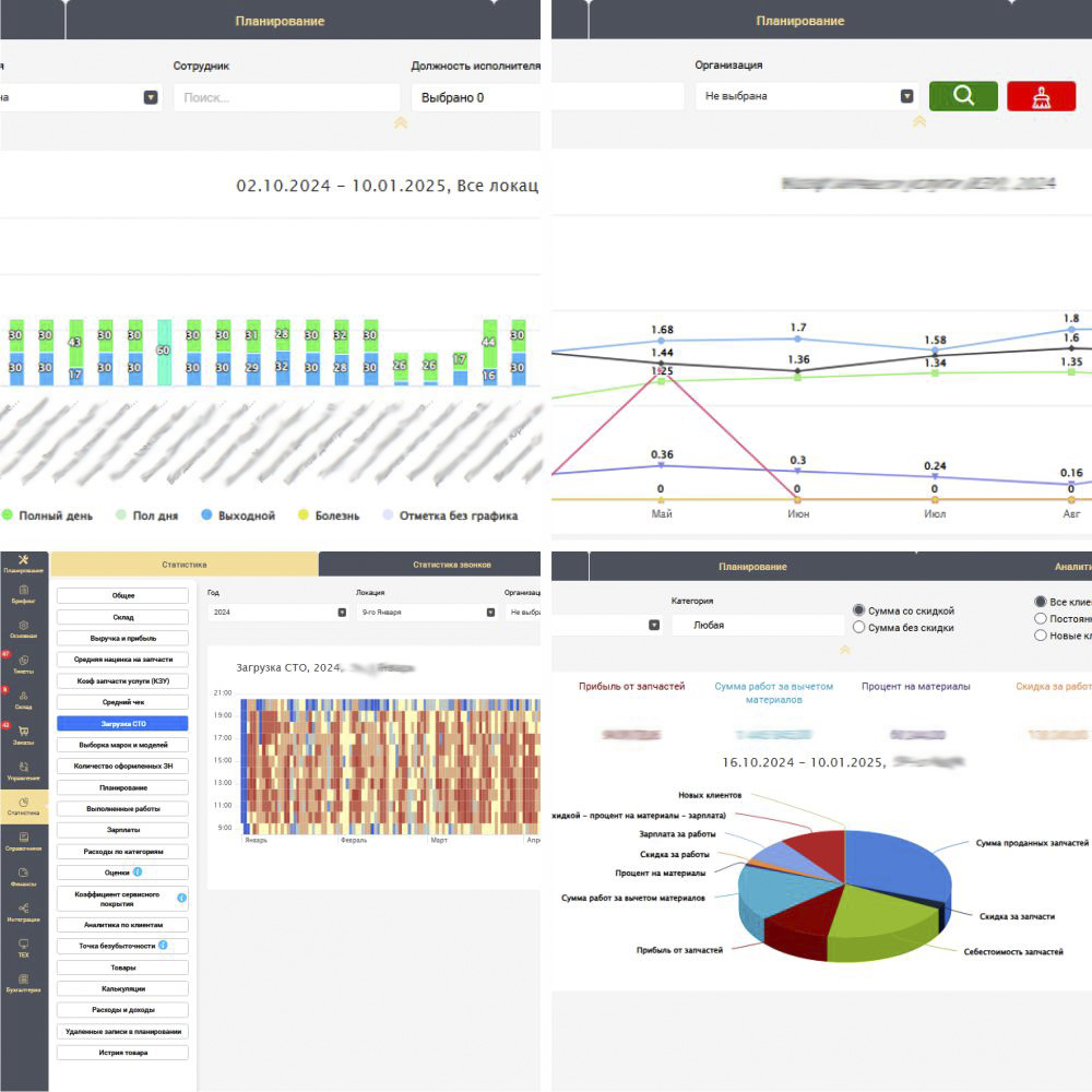 В STOOX есть целая вкладка с различными видами статистики, которые отображены в удобных графиках и диаграммах. Так же для удобства просмотра есть множество различных фильтров (по дате, локации, сотрудникам и многие другие). Узнать выручку за определенный период, загрузку СТО, кол-во оформленных ЗН, расходы на заработную плату, количество положительных оценок от клиентов и многое другое, не составит ни каких проблем.